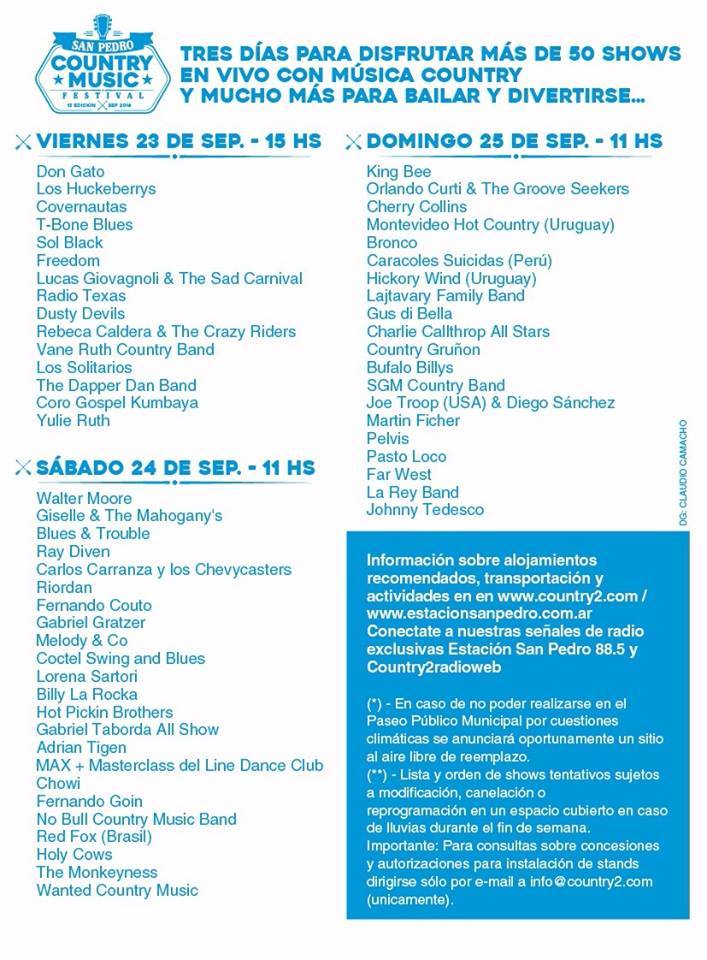 En San Pedro (Bs.As) Se realiza desde el 2003, El festival country con artistas Nacionales e internacional,desde el mediodía en el Paseo Público Municipal.