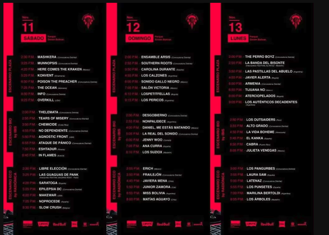 Los Auténticos Decadentes, Aterciopelados, Julieta Venegas, Saratoga, Makewar, La Vida Boheme, LosPetitFellas y Slow Crush son los nombres que completan el cartel para los tres días de presentaciones que se extenderán del 11 al 13 de noviembre en el Parque Simón Bolívar.